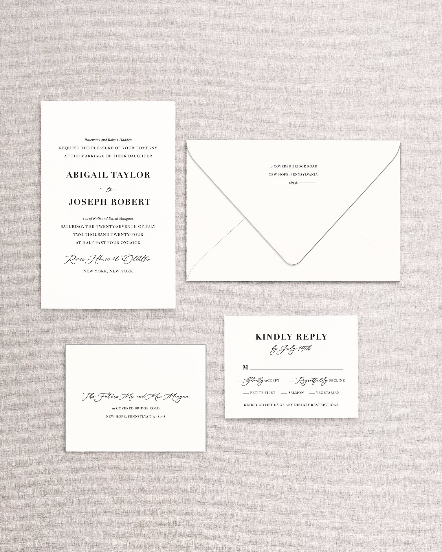 The Abigail Suite is a modern classic, blending bold serif typography for the couple’s names with a refined script accent that adds just the right touch of softness. Its clean lines and contemporary balance make this design versatile for both formal city celebrations and timeless country settings. The 4-piece package includes everything you need for a polished guest experience, from a statement-making invitation to a coordinating response card. To further customize your suite, you may incorporate curated artwork or choose from optional embellishments such as wax seals, ribbons, or hand-painted details. These enhancements are available in our Embellishments Shop and may be added for an additional charge.